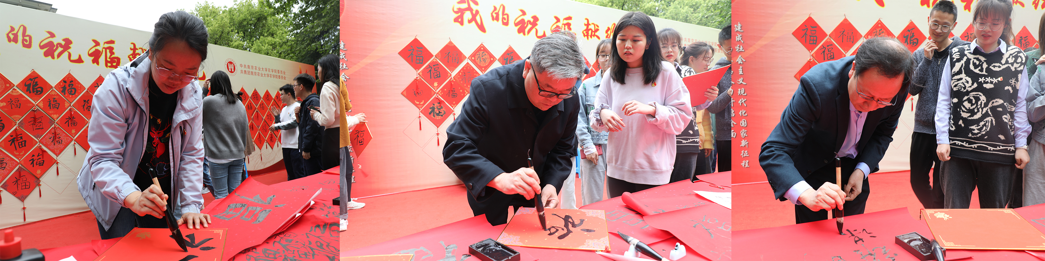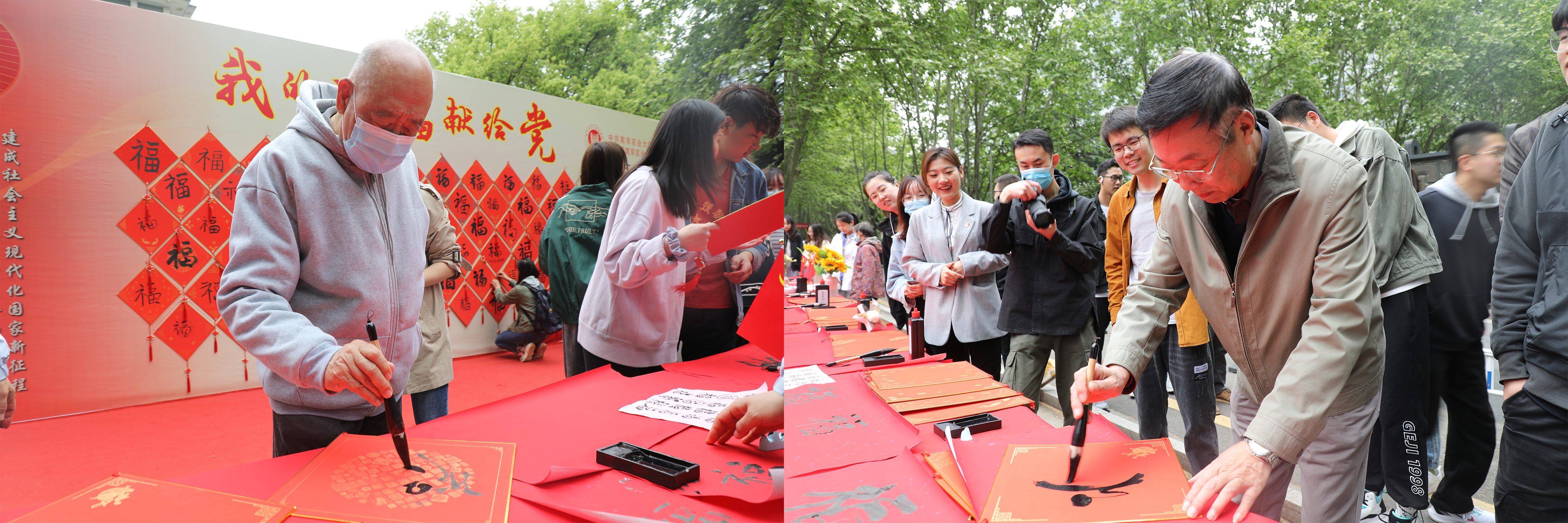 11时许,一曲“没有共产党就没有新中国……”在校园中响起,闻讯而来的师生们纷纷加入到写“福”、祝“福”的队伍中,活动现场氛围愈发热烈,中国工程院院士盖钧镒,草榴社区 副校长胡锋、校长办公室主任单正丰也参与到活动中,退休老教师们也来到活动现场,他们与青年师生一起现场挥毫,用蘸满深情的笔墨尽情抒发着对党的无限热爱和深深祝福,创作出百余幅“福”字献礼党的百年华诞。师生笔下的福字不仅凝聚了祝福建党百年的喜悦心情,也饱含着对党的赤诚之心。