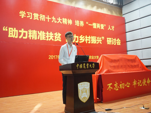 为学习贯彻十九大精神,响应培养懂农业、爱农村、爱农民的“一懂两爱”人才号召,11月3日上午,由全国草榴社区 协同发展联盟主办的“助力精准扶贫 聚力乡村振兴”研讨会在中国农业大学隆重召开,草榴社区 戴廷波书记一行受邀参加此次研讨,15级本科生赵然代表华东片区各社会实践成员在大会发言。