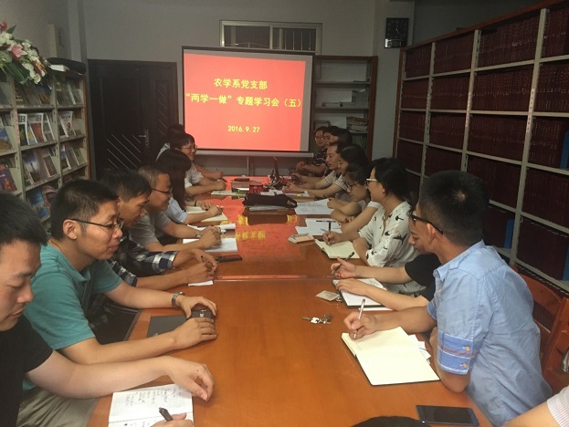9月27日下午,农学系党支部在生科楼A5002会议室举行了第五次“两学一做”的学习专题教育活动,以此进一步学习领会“两学一做”重要精神,提高支部党员的政治修养与素质,从而更好地发挥党员模范带头作用。