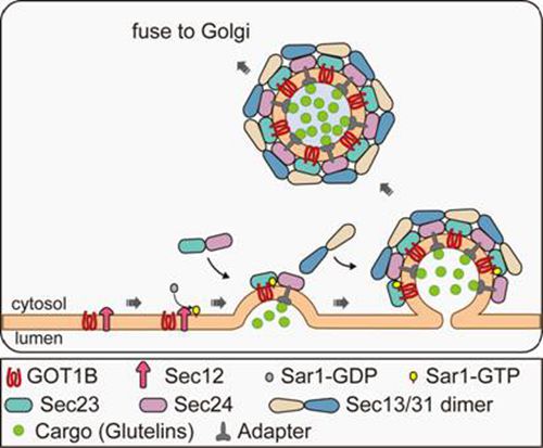 万建民院士课题组研究人员通过大量筛选,获得了一系列的水稻谷蛋白前体异常积聚的突变体,其中一份命名为glutelin  precursor  accumulation4 (gpa4)。研究发现,该突变体积累谷蛋白57-kDa前体,并在发育胚乳细胞中形成两种ER衍生的非正常结构,显示谷蛋白的ER输出存在缺陷。GPA4编码一个进化上保守的膜蛋白GOT1B,该蛋白定位于与顺式高尔基体(cis-Golgi)相连的内质网输出位点ERESs(ER  exit  sites)。GOT1B通过与COPII(Coat  Protein  Complex  II)的组分Sec23c互作,调控COPII转运囊泡的形成,从而有助于植物细胞中谷蛋白正确的ER输出。本研究基本明确了GOT1B的功能,为探讨真核生物中COPII组装的调控提供了新的视角。