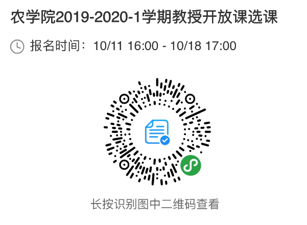 本学期草榴社区 “教授开放研究课程”如下表,请有兴趣的同学积极选课,请需要选课的同学在2019年10月18日下午5点前扫描下方二维码,通过微信小程序报名(扫描后进入报名界面,点击“立即报名”即可开始报名)。选课后如想退选,也可在截止日期前通过小程序取消报名。