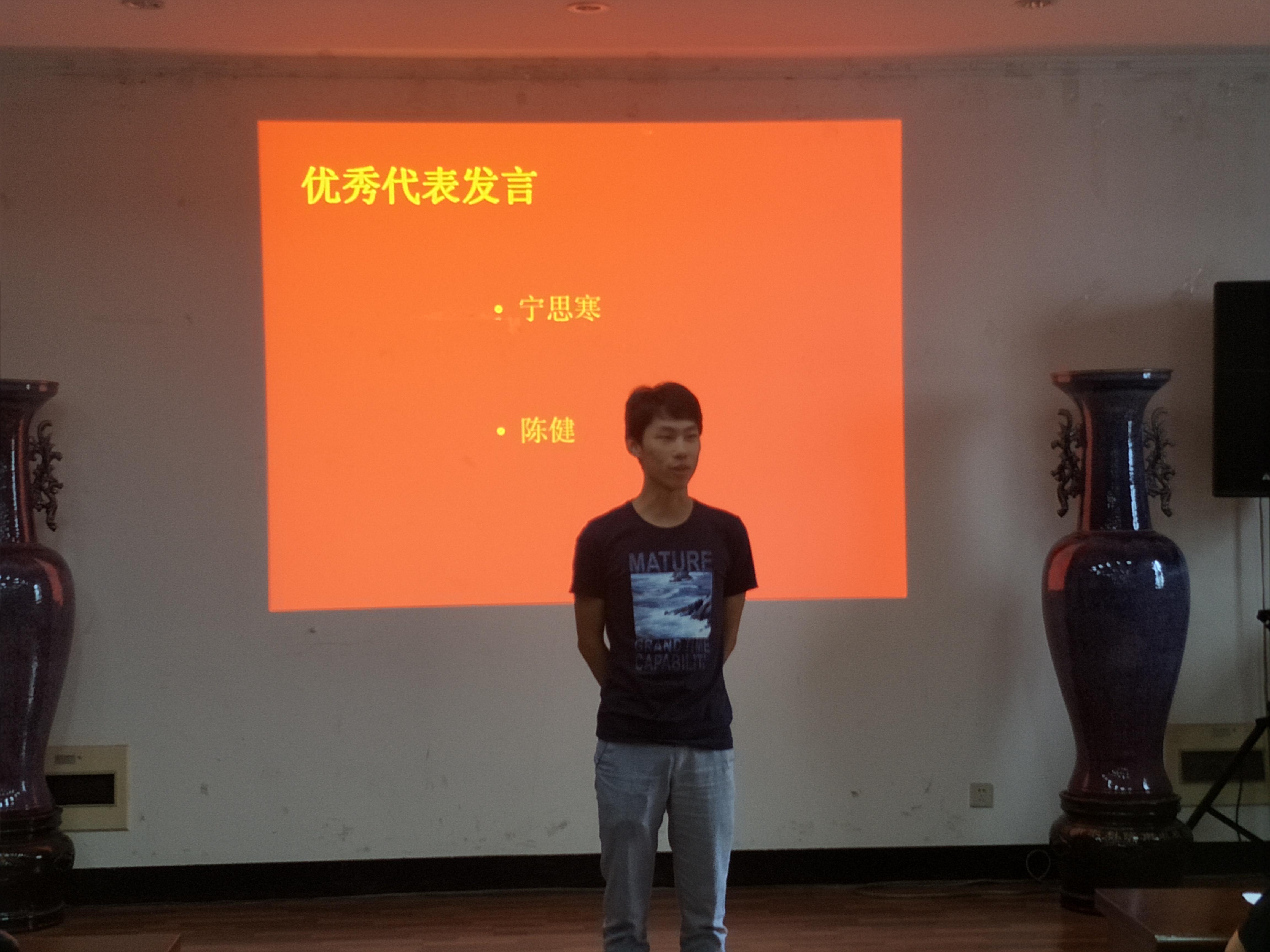 接下来,考核优秀的预备党员代表陈健和宁思寒同学上台跟大家分享了自己在“党员一帮一”活动中的经验和感想,最后实践部部长也对本次活动作出总结,提出建议和要求。