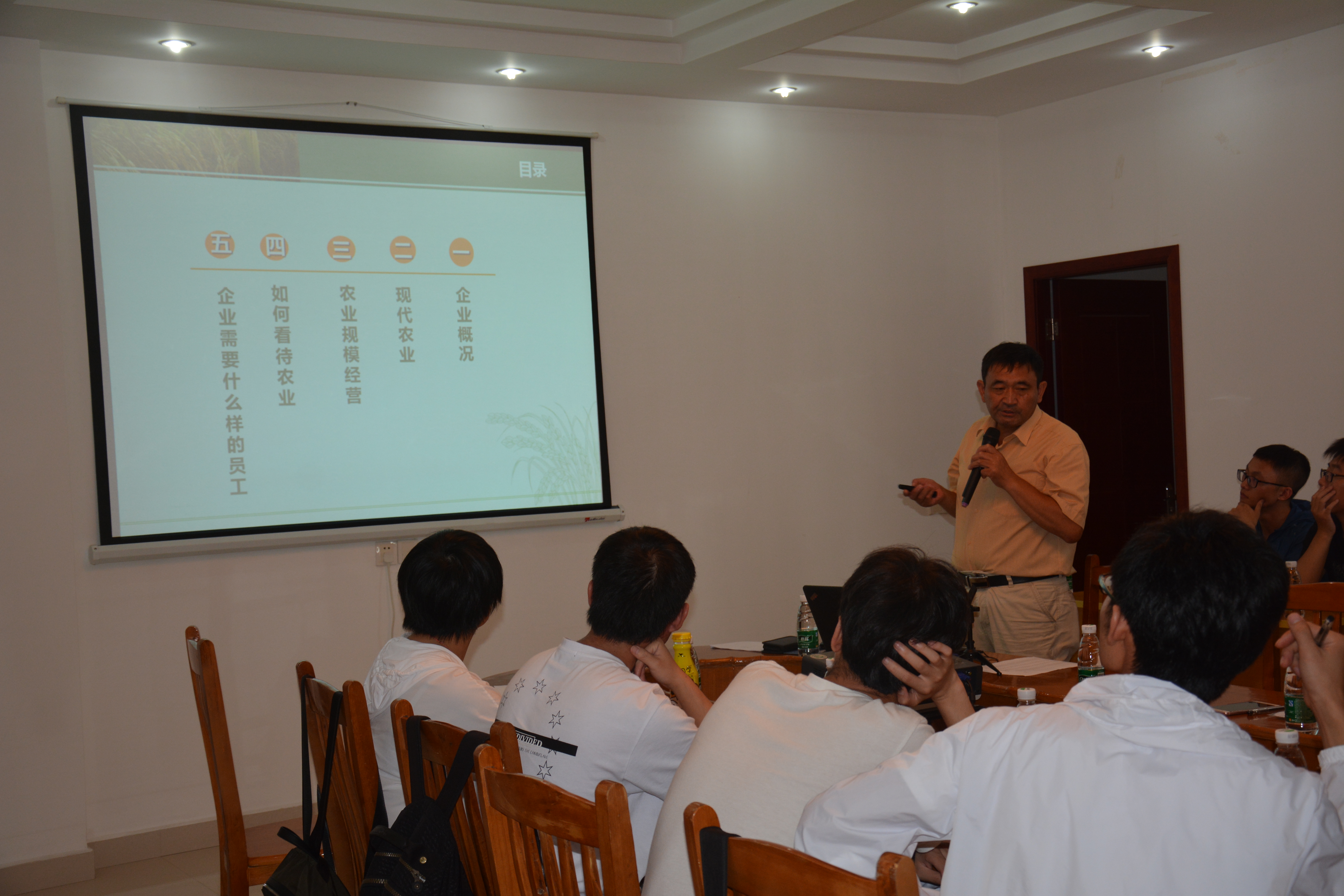 之后,王宣山研究员给大家作了以“以规模经营引领现代农业发展”为题的报告,他从企业概况、现代农业、农业规模经营、如何看待农业、企业需要什么样的员工等五个方面给大家作了详细的讲解,同学们从报告中了解到金色农业研究生工作站的优劣势、面临的机会与挑战;国家《“十三五”农业科技发展规划》中现代农业的发展目标、农业农村人才队伍建设等内容。最吸引同学们的部分是企业需要什么样的员工,王宣山研究员通过分析普通员工和优秀员工的十大区别,让同学们知道自己应该怎么做,才能在如今激烈的就业形势下找到满意的工作。